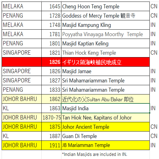 下記のそれぞれの地での最古ないしはほぼ最古の寺院は、マラッカ、ペナン、シンガポールではほとんどが第一段階で、少し遅れKLとジョホールが第二段階にあることが、おおまかなイギリスの影響度と寺院との関連、といえます。